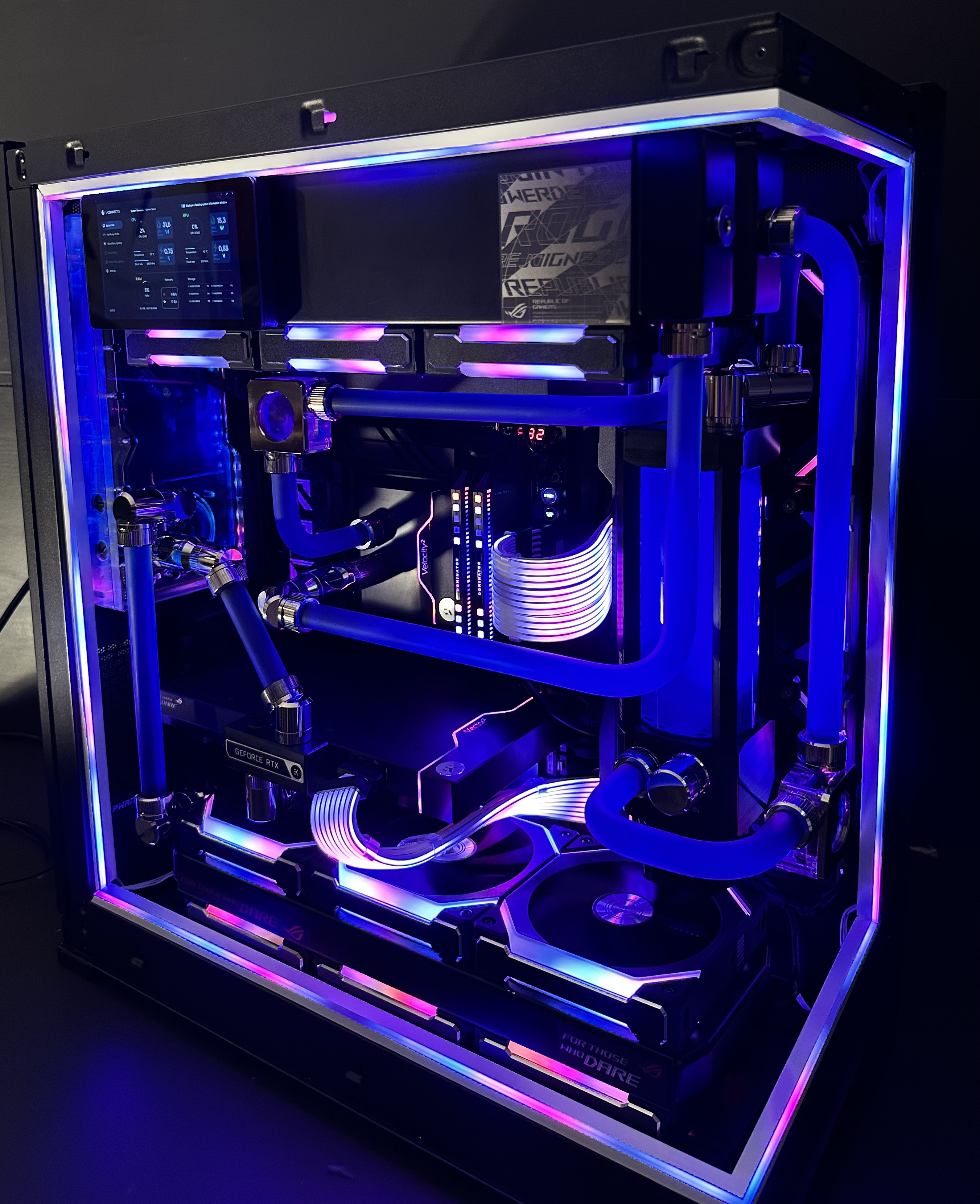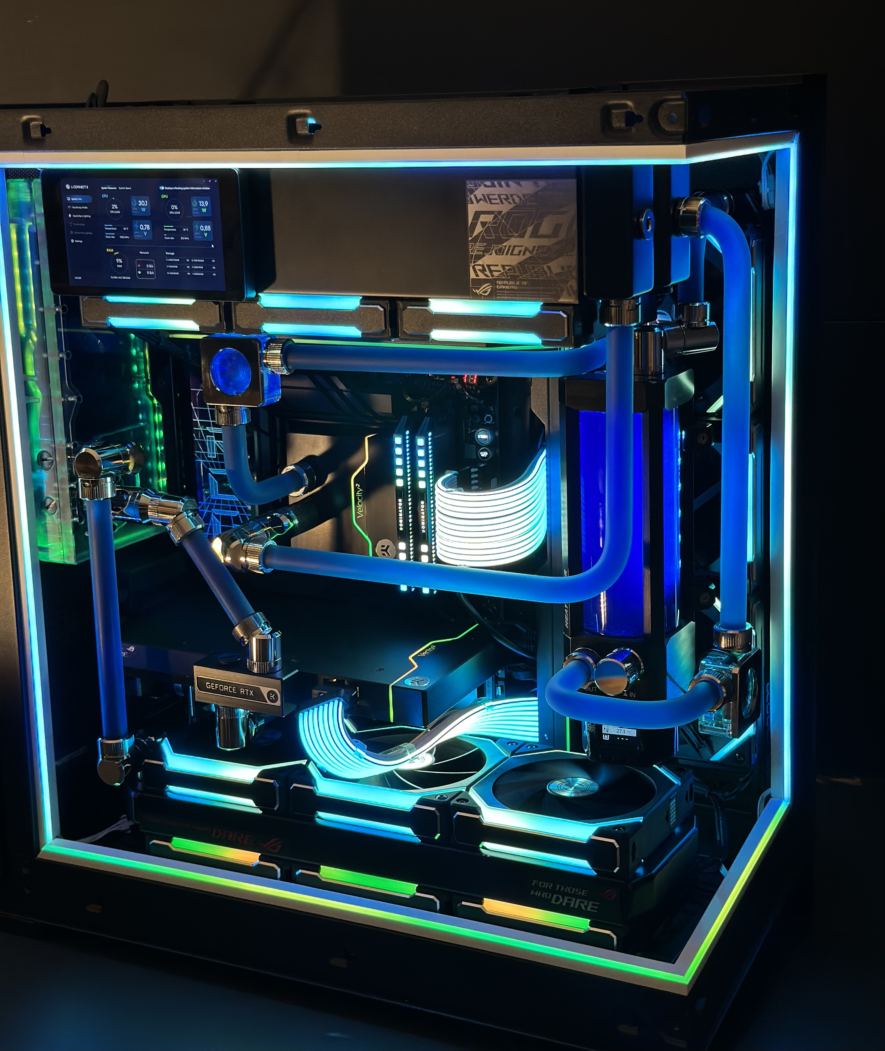 Wir bieten dir ein exklusives Custom Wasserkühlungs-System. In der Wahl der Komponenten sind keine Grenzen gesetzt. Ob Flat Reservoirs, Tube oder Distroplate. Ebenso realisieren wir Dual Systeme / Mo-Ra Anschlüsse sowie wenn gewünscht eine individuell geplante Tubeführung, etwa mit möglichst wenigen oder ganz ohne Winkel. Diese Details kann man selbstverständlich auch noch weiter verfeinern. -
